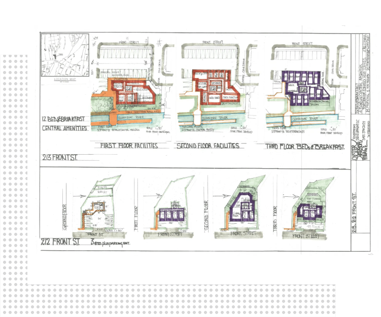 Completed is schematic design and design development and the site plan including the following facilities: 2 senior retirement residential complexes on 201 and 213 Front Street totaling 52,000 square feet of building. The 201 Front Street complex provides 35 diversified senior retirement residences comprised of studios, one and two bedrooms on three floors above the ground floor with direct waterfront exposure for the majority of the units, waterfront access, and the penthouse floor. The 213 Front Street complex comprises 32 senior retirement residences. Most penthouse units have very large terraces overlooking the River and public gathering spaces. Each penthouse floor provides for 900 square feet of public terrace gardens overlooking the water for the complex's residents' use. The buildings are all designed and spaced from each other by at least 60-70 linear feet to allow continuous vistas to the River from Front Street.