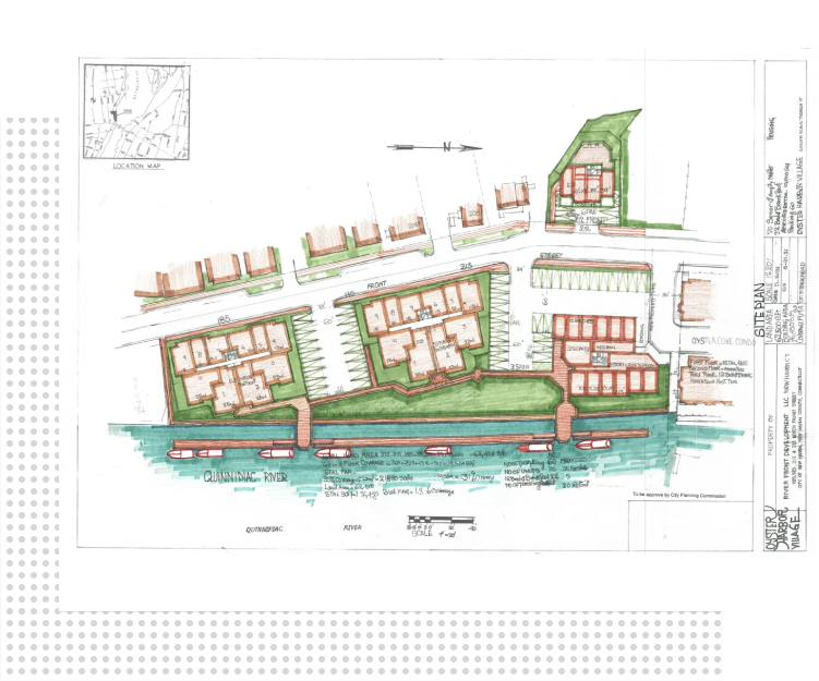Proposed Development - Oyster Harbor Village on the west side of Quinnipiac River, comprised of 62,300 square feet of land with 500 linear feet of waterfront on 185, 195, 201, 212, and 213 Front Street.